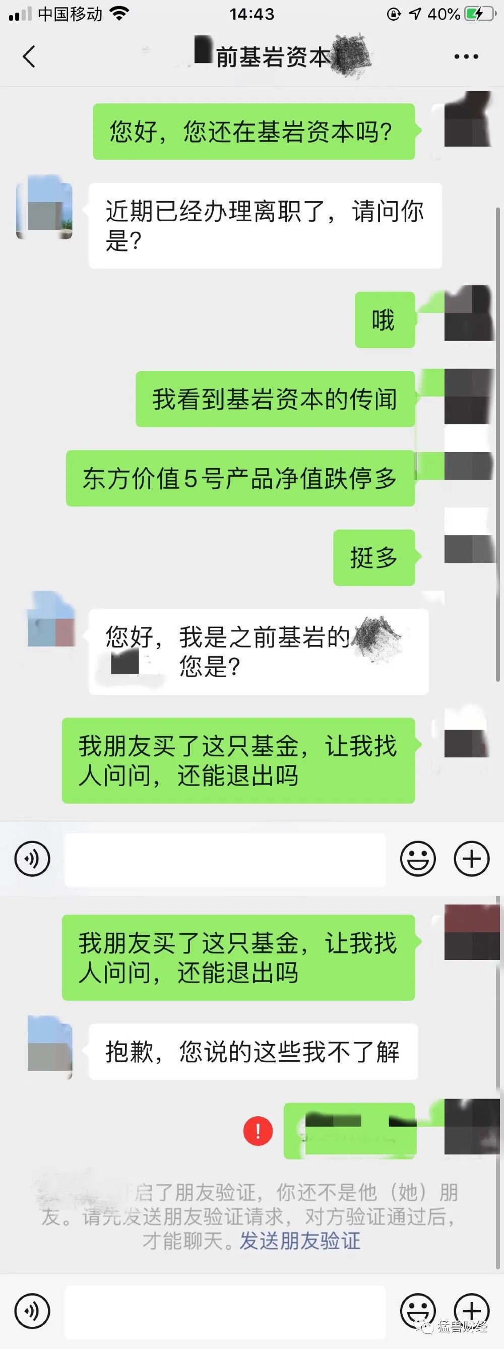 为了求证价值投资5号产品净值大跌一事,猛兽财经联系到一位前基岩资本的员工,询问关于东方价值5号产品的问题,这名前基岩资本员工表示,自己近期已经办了离职,对产品的情况不清楚。