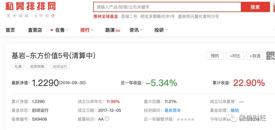 猛兽财经在在私募排排网上看到,基岩-东方价值5号基金目前在清算中,基金相关信息停留在去年9月30日,之后的信息不再更新。2019年9月30日的净值为1.229,累计涨幅为22.9%,成立以来实现了年化11.99%的收益,最大回撤为11.21%。在去年8000多只基金排名7473名,排名比较靠后。基岩资本去年曾经表示,中概股受贸易摩擦带来的市场情绪上的低迷,造成了股价上的不尽如人意。