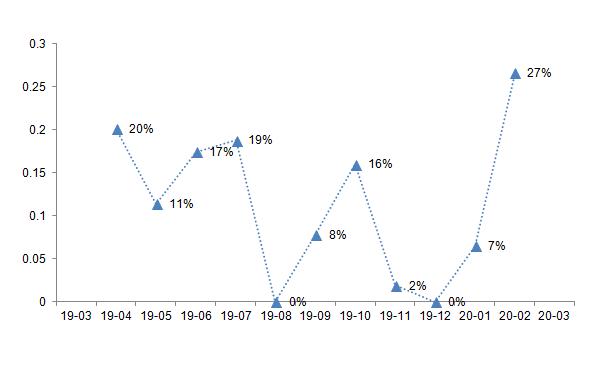 2019年3月~2020年3月北京住宅用地溢价走势数据来源:CREIS中指数据