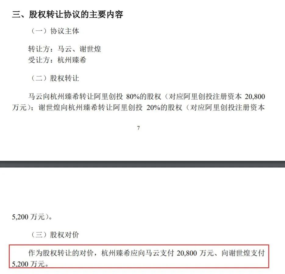 交易完成后,杭州臻希将持有阿里创投100%股权。马云全部出清阿里创投,正式退出。股权转让协议中提到,作为股权转让的对价,杭州臻希应向马云支付 2.08亿元、向谢世煌支付5200万元。