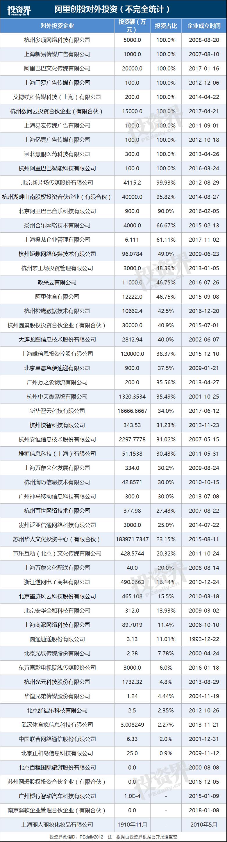 此外,阿里旗下还有以参与定增、并购等成熟期项目为主的泽泰信息;阿里旗下的阿里巴巴台湾创投公司,其发起设立了阿里巴巴创业者基金等等。