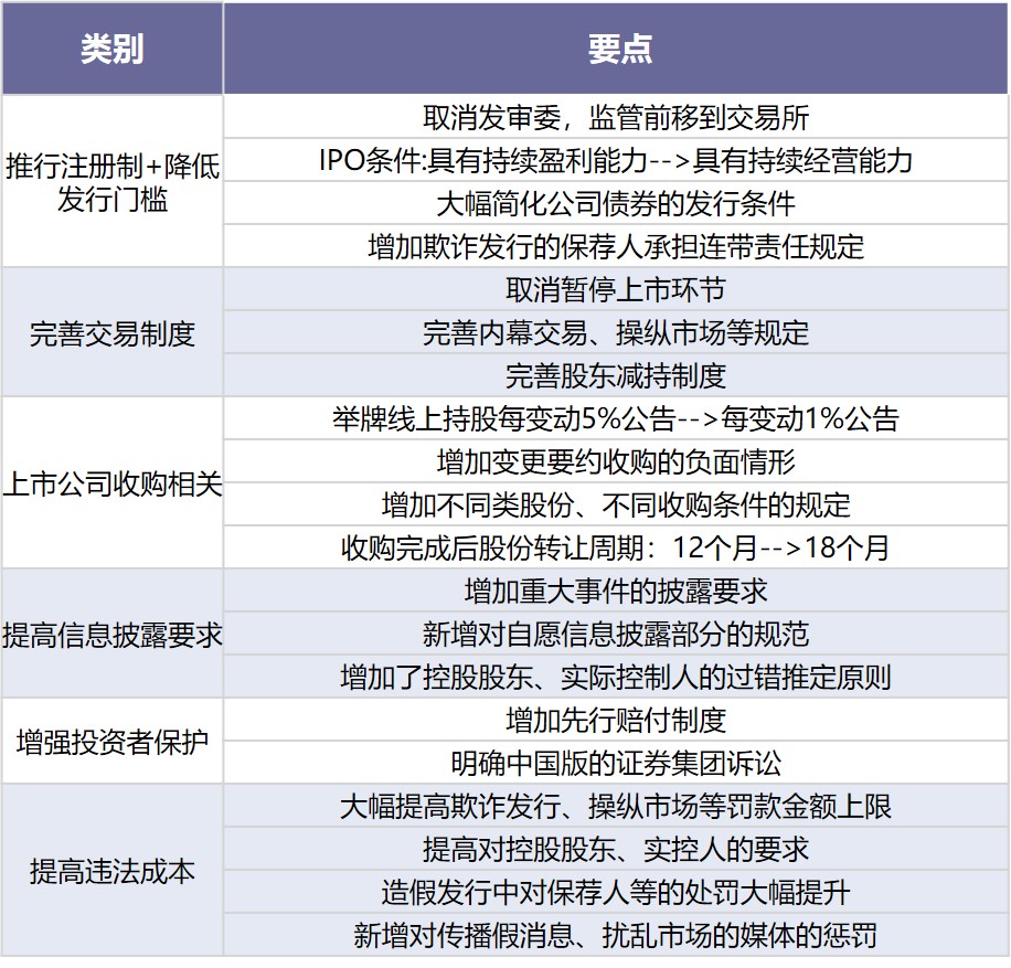 3月1日,修订后的《中华人民共和国证券法》正式生效。本次修订历时四年多、历经人大四次审议,是我国《证券法》实施20多年来最大的一次修订,重要改动为推行注册制、提高证券违法违规成本、完善投资者保护制度等。主要修订如下:
