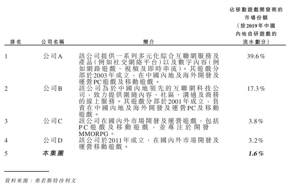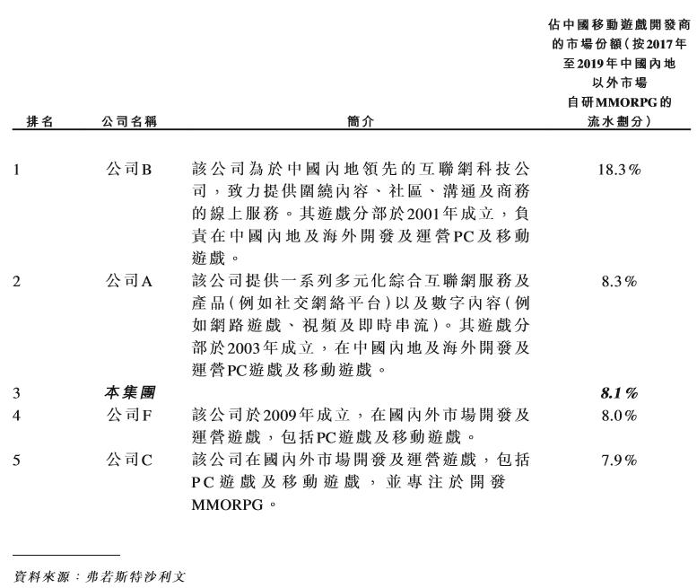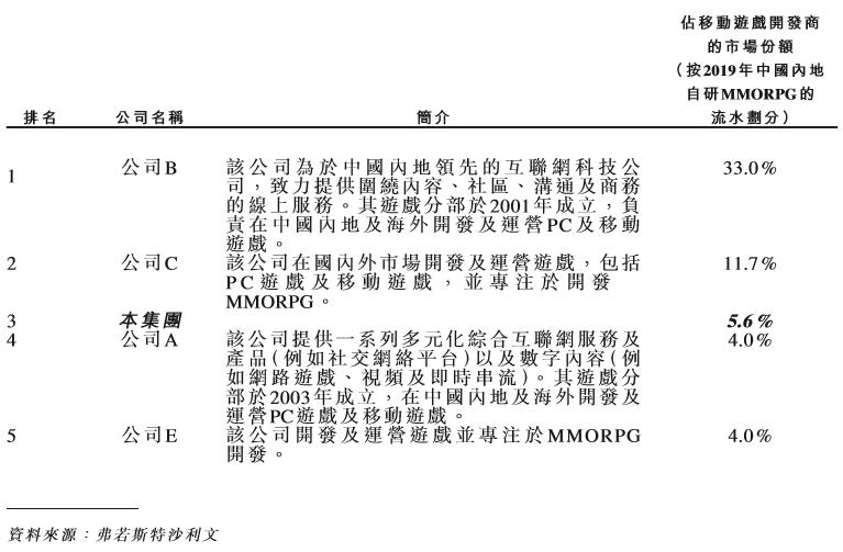 其中,公司B自研产品的市场份额居然占据了大盘的33.0%,遥遥领先于其他公司。据「致力提供围绕内容、社区、沟通及商务的线上服务,游戏分部于2001年成立」的描述推测,公司B应该是网易。