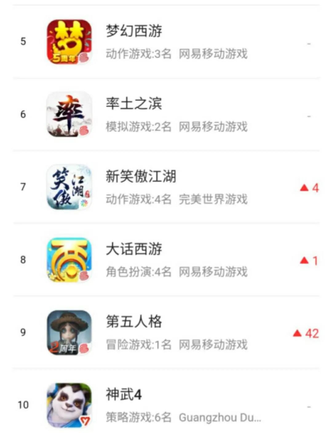 第三、四、五名被网易包揽,葡萄君推测,可能分别是《梦幻西游》、《大话西游》以及《梦幻西游三维版》、《倩女幽魂》手游、《一梦江湖》其中的一款。