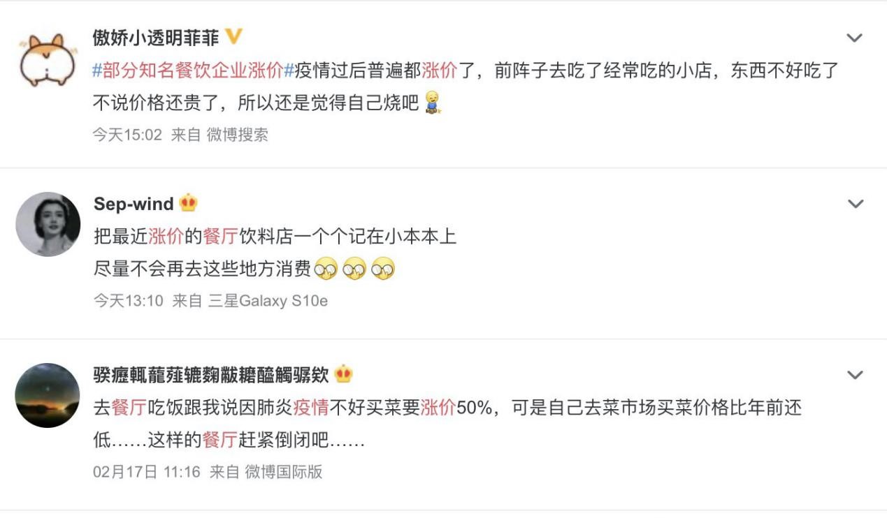 而且,从微博上看,吐槽餐厅复工之后价格上涨的消息比比皆是。