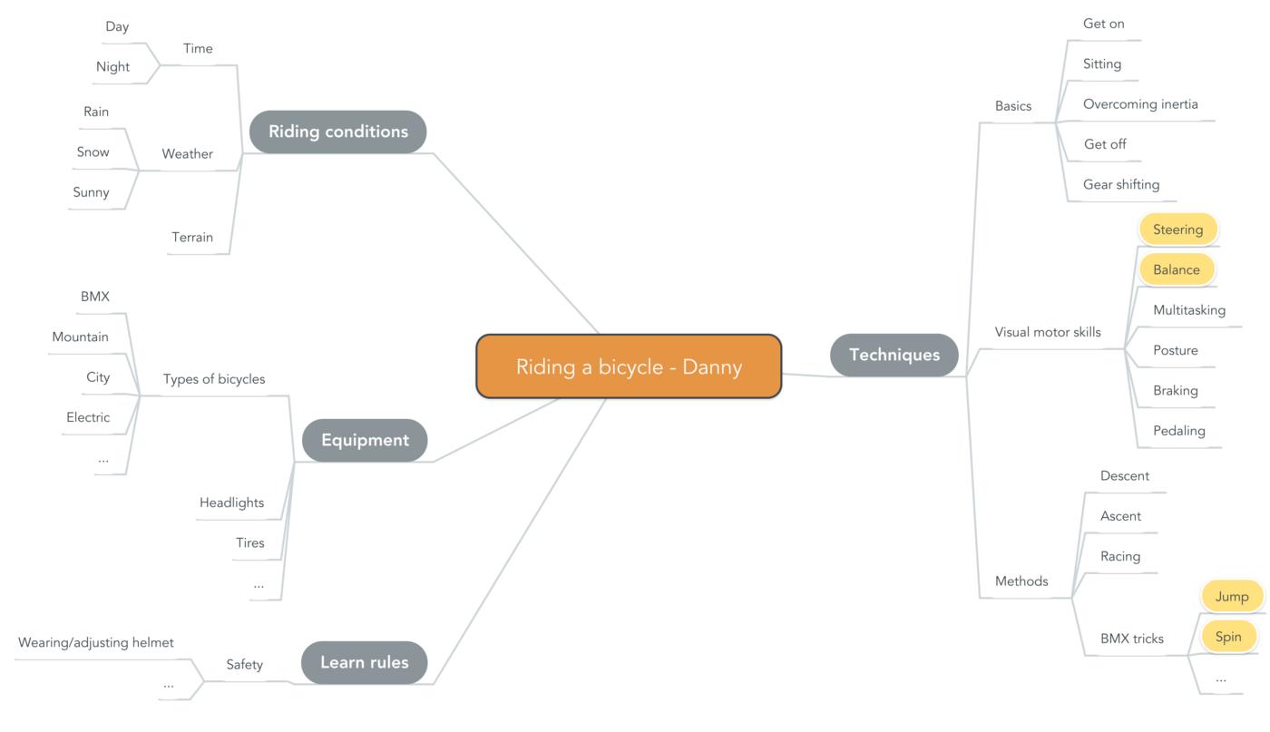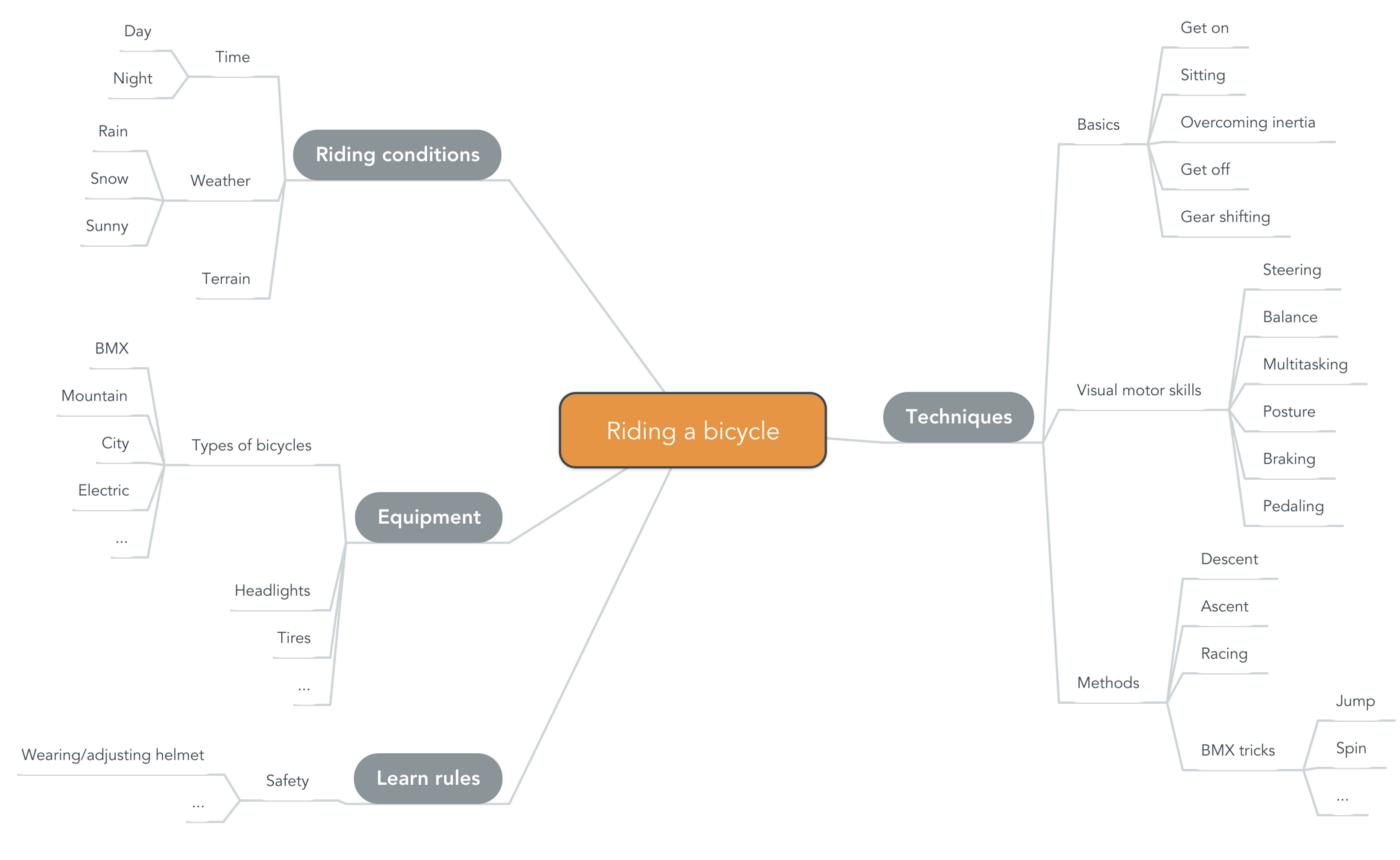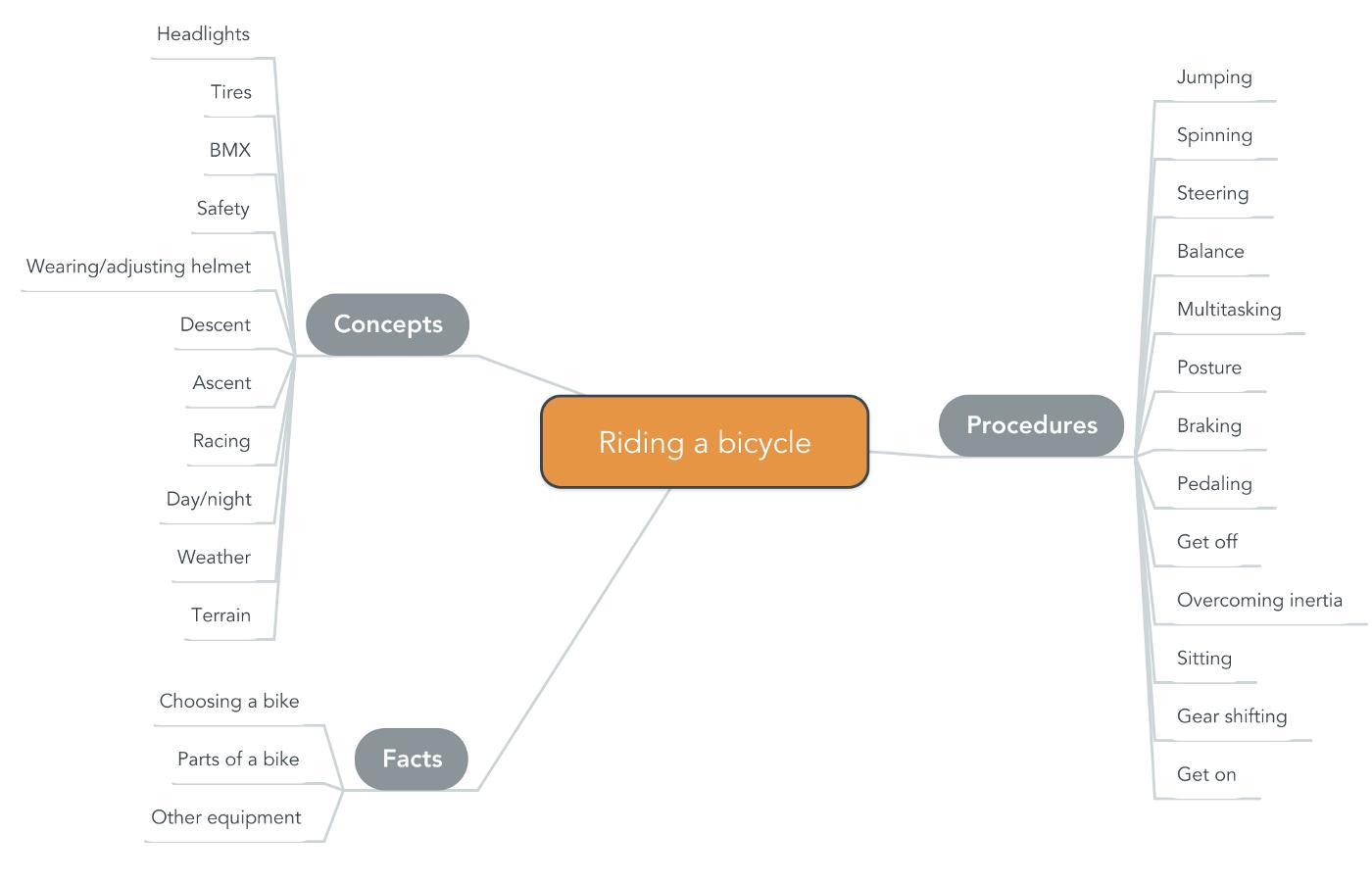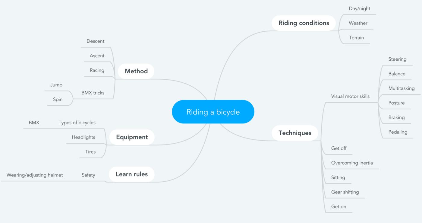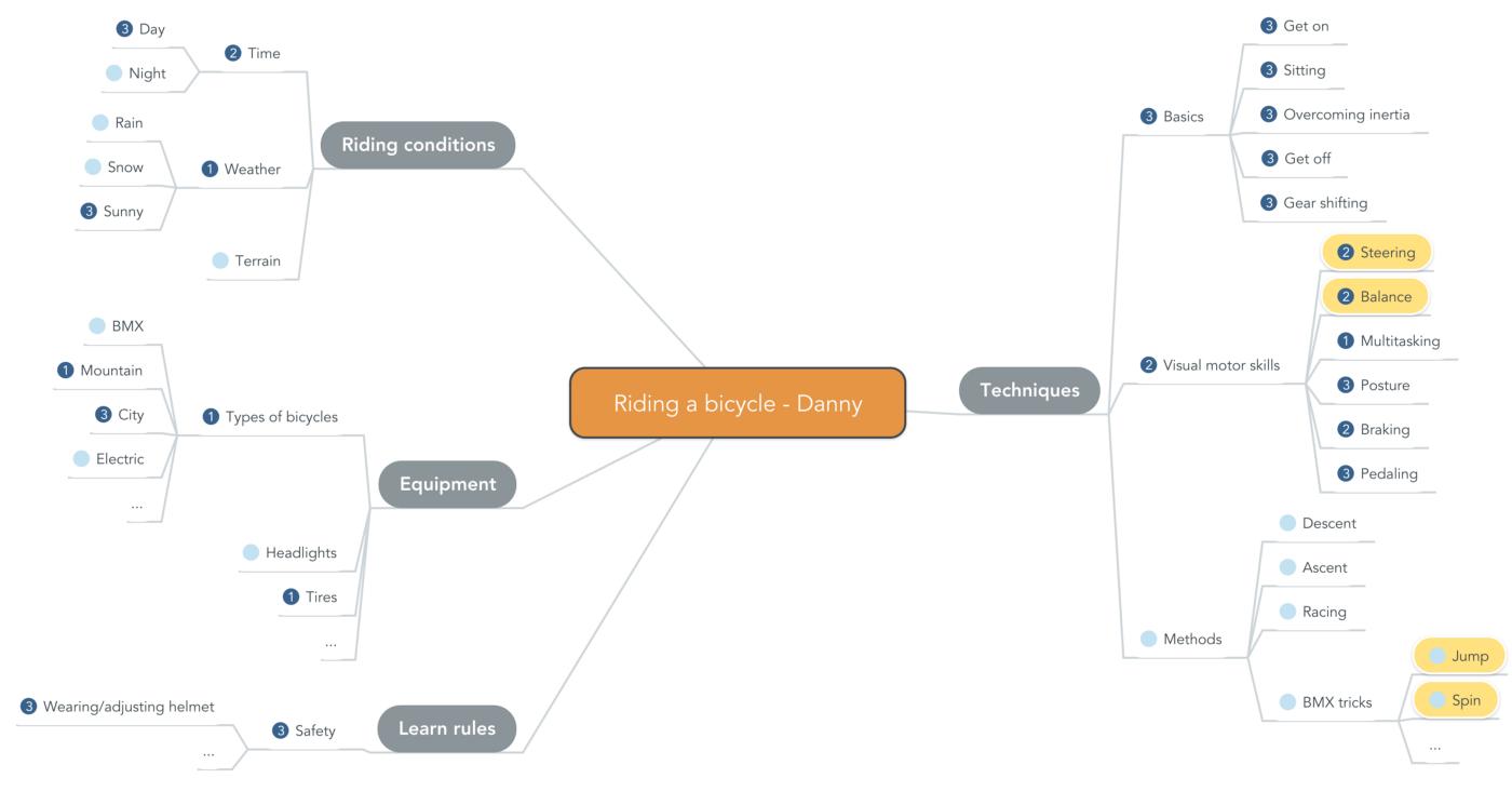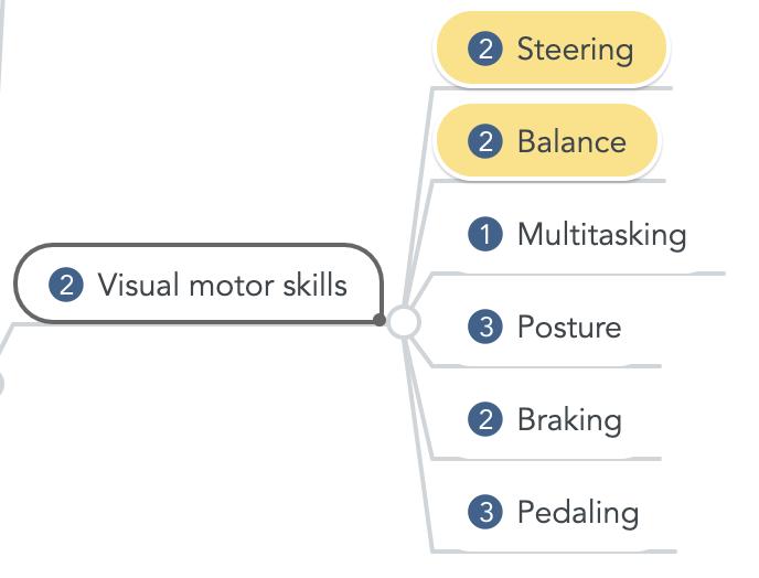 以概念为例,我罗列了前灯、轮胎、自行车越野(BMX)、安全、戴/调整头盔、下车、上车等内容;再以进程为例,我又罗列了加速、转向、平衡、多任务处理、姿势、刹车、踏板等内容。