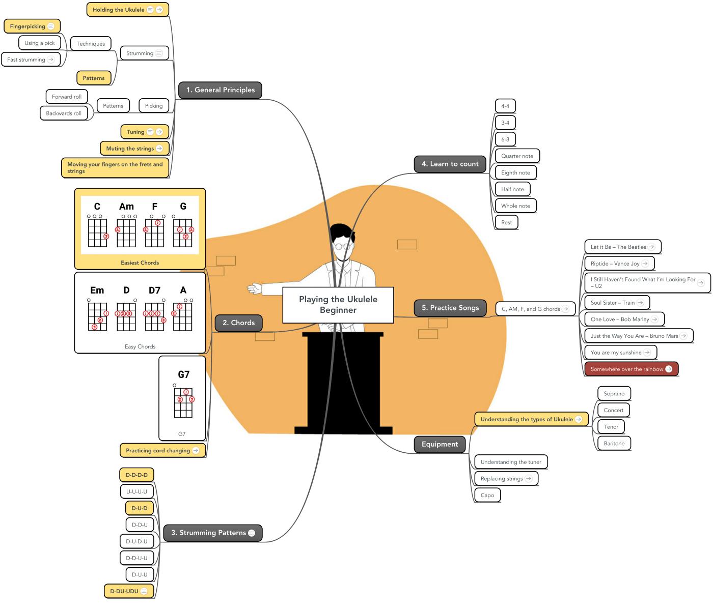 就这些分项知识与技能而言,同样也可以延伸出更多的分项知识与技能。比如,就了解尤克里里而言,可以包括了解不同类型的尤克里里、了解调音器和变调夹,以及如何更换琴弦等等。