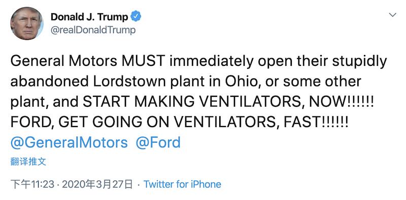 此外,美国福特、通用、特斯拉等美国车企均已获批制造呼吸机设备,3月27日,特朗普还在推特上点名通用汽车和福特汽车,督促他们马上生产呼吸机。