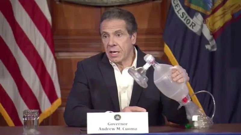 怒斥美联邦政府、疾呼呼吸机告急的纽约州州长科莫在3月28日介绍并亲身示范了应急的“备选方案”:通过手动挤压下图所示的呼吸气囊,为呼吸不畅的患者供氧,这种气囊俗称“手捏皮球”。