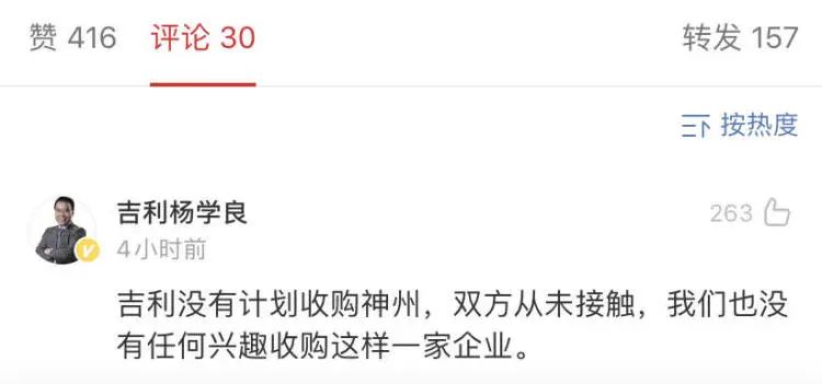 “吉利没有计划收购神州租车,双方从未接触,也没有任何兴趣收购这样一家企业。”