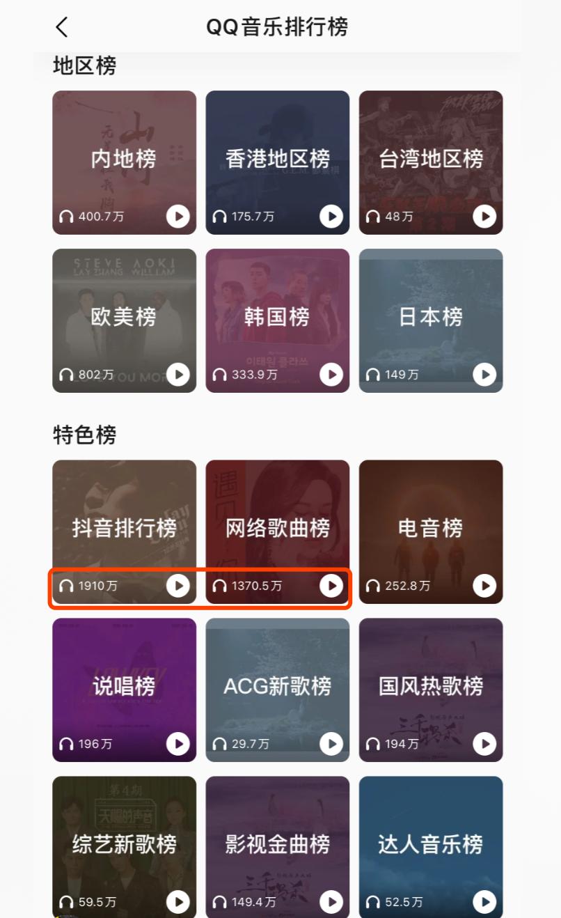 QQ音乐排行榜显示,网络歌曲和抖音排行榜的播放量远远高于其他类型音乐,比内地榜高出近5倍。