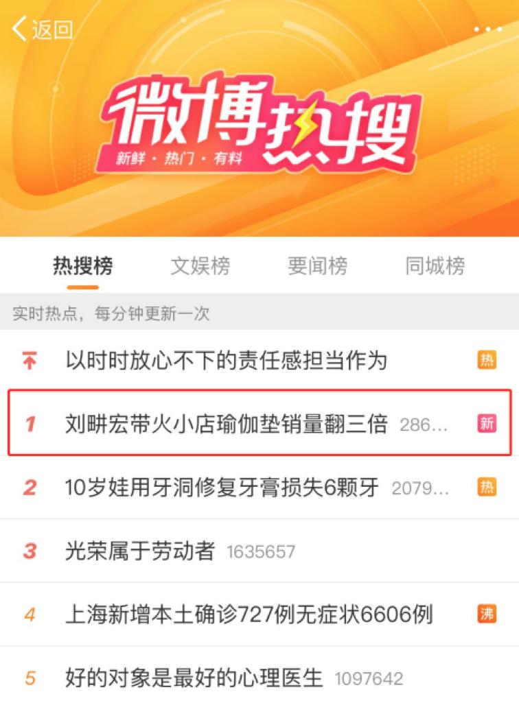 #刘畊宏带火小店瑜伽垫销量翻三倍#登上微博热搜榜第一(图源:@白鹿视频微博)