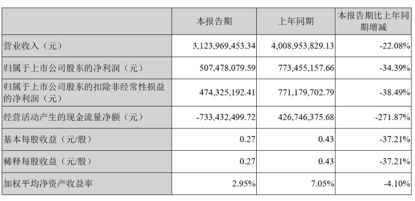 营业收入同比减少22.08%,为31亿元;归属于上市公司股东净利润同比减少34.39%,为5亿元;其现金流量净额更是同比减少了271%。