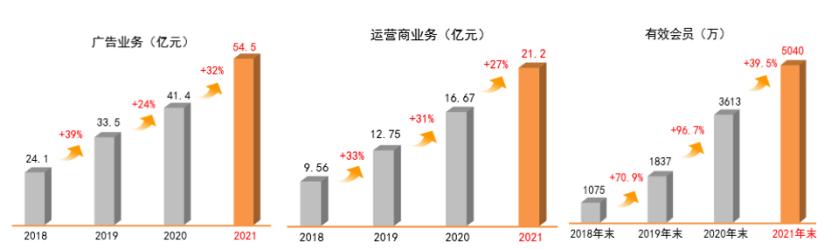 营业收入同比增长9.64%,为153亿元;归属于上市公司股东的净利润同比增长6.66%,为21亿元。其广告业务、运营商业务和有效会员数有保持持续高增长态势,截至年末,其广告业务收入已达54.5亿元,比B站的45.2亿元高,略低于爱奇艺的71亿元。