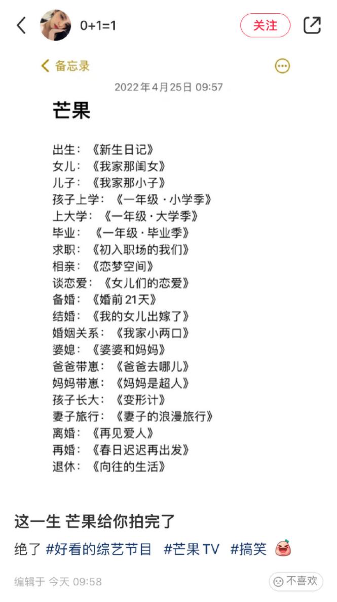 前不久,“芒果台拍完了人的一生”登上微博热搜第一,网友们指出在人生各个阶段,芒果都有对应的综艺,比如出生对应“新生日记”,结婚对应“我的女儿出嫁了”, 离婚也有“再见爱人”。