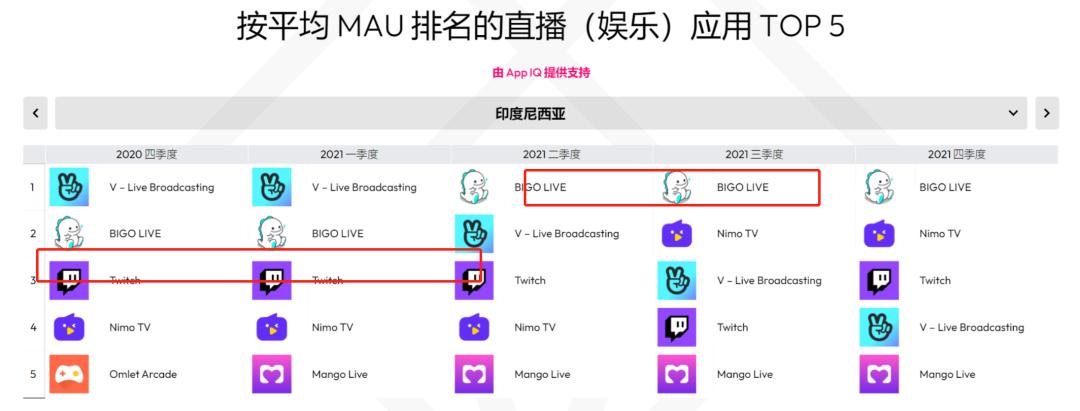 上述财报中重点提及了 Q4 Nimo TV 在印度尼西亚的增长,而从 data.ai 报告来看,同样呈上升趋势,Nimo TV 在 2021 年 Q4 MAU 在印尼位居第二,仅次于 BIGO LIVE,高于 Twitch 目前该地区业务也面临关停(数据来源:Data.ai)