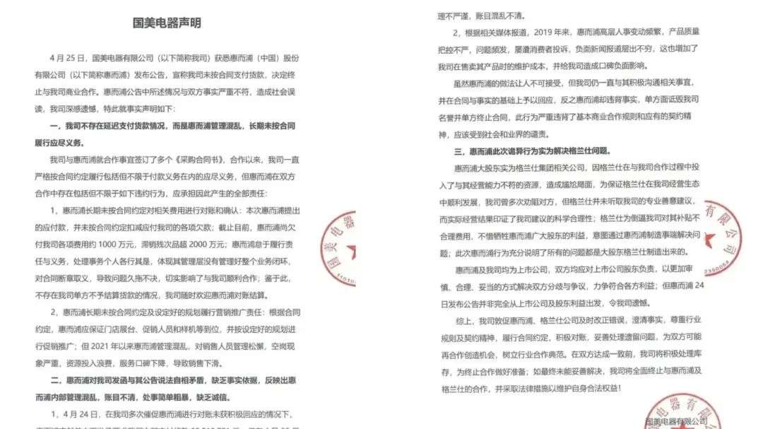 最近家电圈的一个纠纷得到了业内外关注。知名白电制造商惠而浦发布公告称,因国美电器长期拖欠货款并且情况持续延迟恶化,公司决定即日起终止与国美电器的商务合作。另一方面,4月26日早间,国美电器发布声明回应称,公司不存在延迟支付货款情况,是惠而浦方面长期未按合同履行义务。