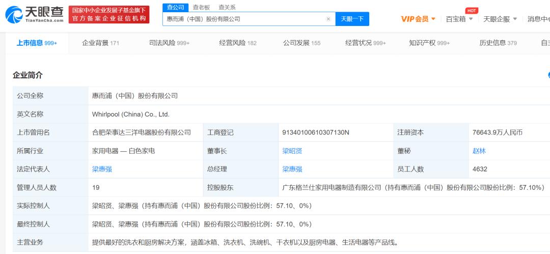 据天眼查数据统计,格兰仕家用电器持有惠而浦中国公司股份3.92亿股,占公司总股本约57.10%,为公司控股股东。惠而浦中国公司实际控制人变更为梁昭贤和梁惠强。