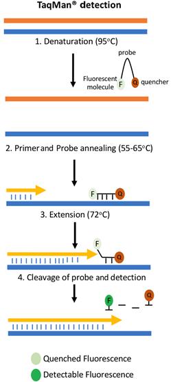 你可以把 TaqMan 探针这样理解:它的主体部分是一段寡核苷酸链,被设计成能和一小部分需要复制的基因片段配对成双链的样子;它一端接了一个荧光分子,另一端接了一个开关(淬灭基团),两者和探针相连时,荧光就会被淬灭基团压制,探测不到。退火时,这个探针会和引物一起结合在要复制的单链片段上。在延伸的过程中,DNA 聚合酶会把挡在面前的障碍物切碎,其中就包括这段探针,淬灭基团和荧光分子就这样分离,荧光就表现出来。