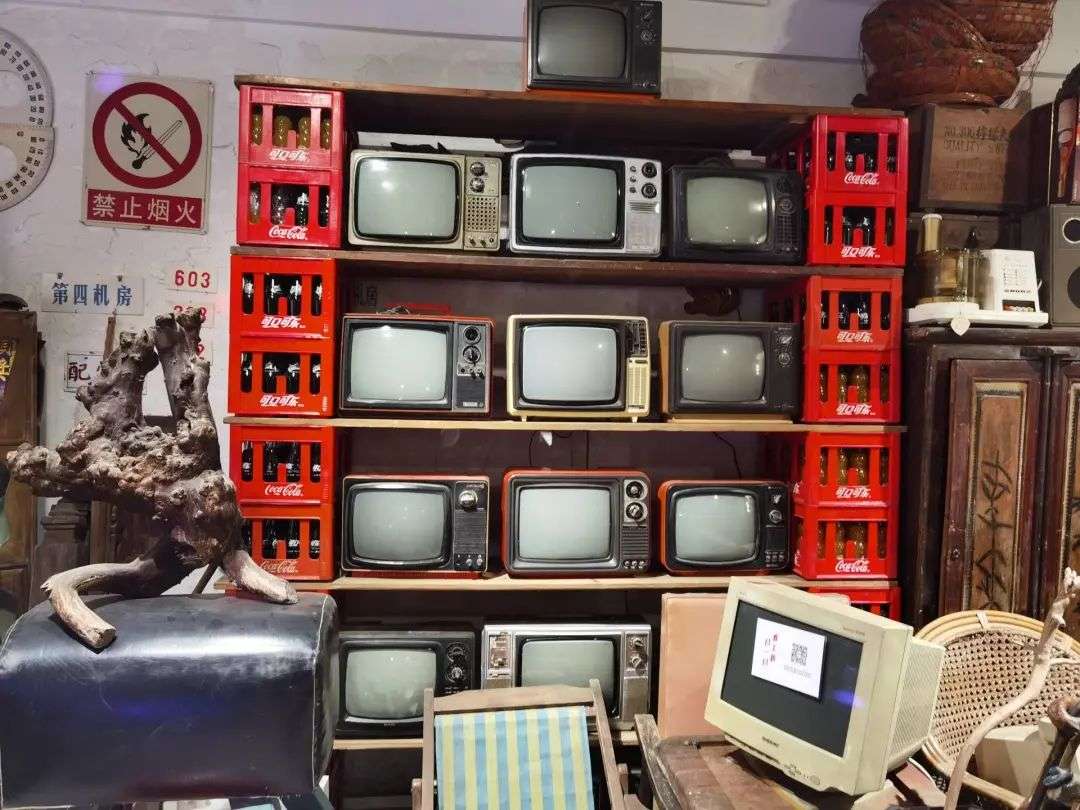 不过,和广东人喜欢在门口放石狮子镇宅不同,店门口的左右放了两只绿的冰箱,就是80年代家家户户都有的那老式冰箱。透过玻璃,还可以看见里面堆满的各种怀旧物件。