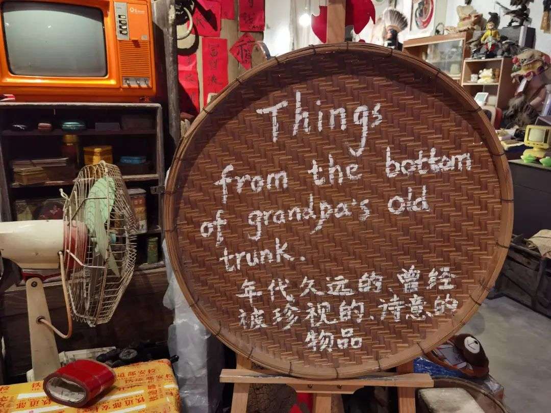 入门的KT板上面则写着:“支付9元,可以上二楼看更多的旧物”。 二楼房间的簸箕上,用白色的颜料描摹着关于店铺的介绍: “年代久远的、曾经被珍视的、诗意的物品。”