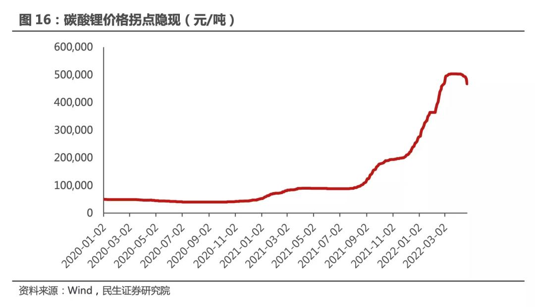 行业周期见顶,价值锚点预期改变,则是很多投资机构的认识。近几年新能源原材料持续上涨对于整个行业来说是持续压力测试。“没想到碳酸锂能从3万涨到50万,以前觉得涨个20%-30%,没想到涨了20倍。”一季度财报会上,宁德时代高层这样说。原材料涨价的幅度和时间远超宁德时代的预期,所以宁德时代选择硬抗涨价同时积极布局上游产业。但50万的价格已经到了其承受极限,这个时候高价买买买无疑是站在了周期峰顶,不能再以3万每吨的盈利能力去做预测,对于长久的盈利能力自然会造成影响。