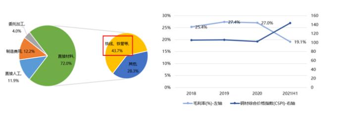 从成本端看,由于直接材料占成本的七成以上,因而产品的盈利水平很大程度上受制于原材料的价格。钢铁制品作为最主要的材料,在成本中的占比达到了约44%,当公司的成本随着的钢价起伏而变化,传导至利润端,就表现为钢价与毛利率的反向背离。