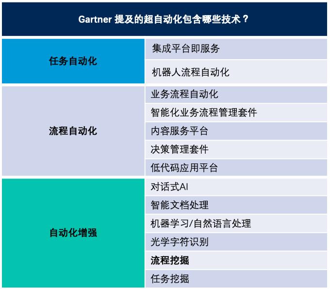 Gartner 认为,驱动流程挖掘市场发展的五大因素是数字化转型、人工智能、任务自动化、超自动化和运营弹性, RPA 便属于任务自动化范畴。