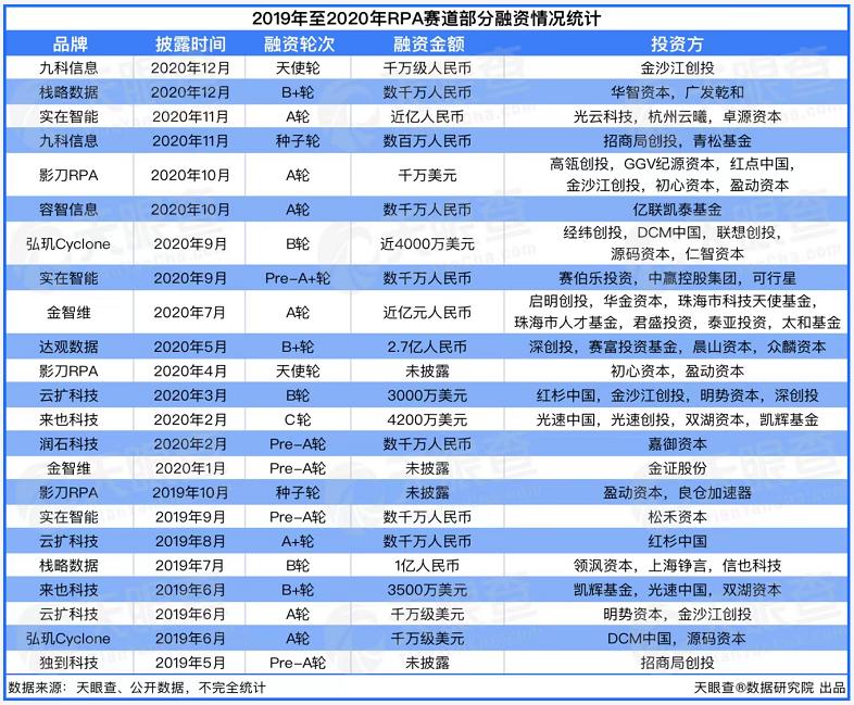 在2019年~2020年,中国曾进入一次 RPA 创业、投资热潮,据天眼查数据显示,两年时间里, RPA 赛道融资事件超过20起: