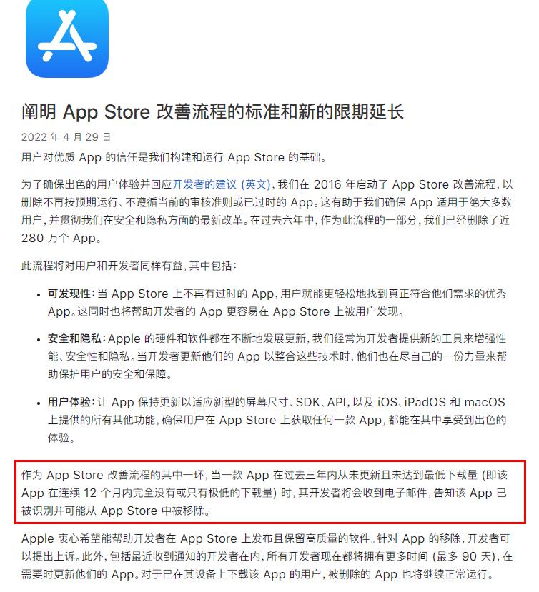 如果 App 在过去三年内从未更新且未达到最低下载量(即该 App 在连续 12 个月内完全没有或只有极低的下载量),则开发者会收到电子邮件,告知该 App 已被识别并可能从 App Store 中被下架。