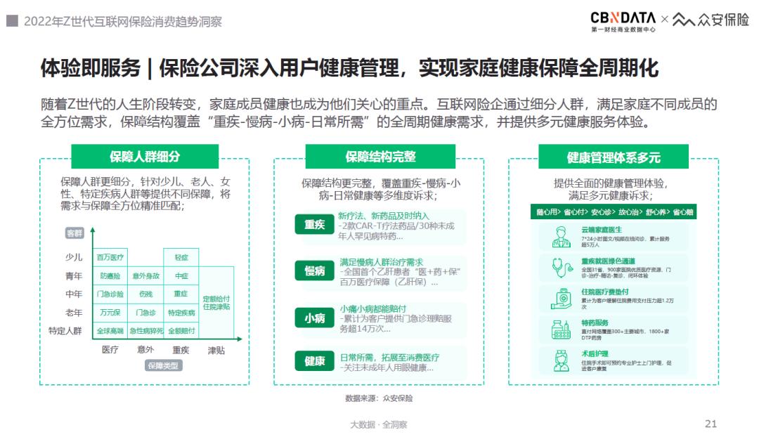 顺应这一认知,互联网保险公司也在不断提升增值服务的价值,满足Z世代“不出险也能享受服务”的实用需求。如众安保险推出的“尊享e生2022”升级产品中,提供癌症早筛、宠物健康管理等9大健康管理增值服务,即使不生病也可以使用,加深了保险服务在日常生活中的渗透。