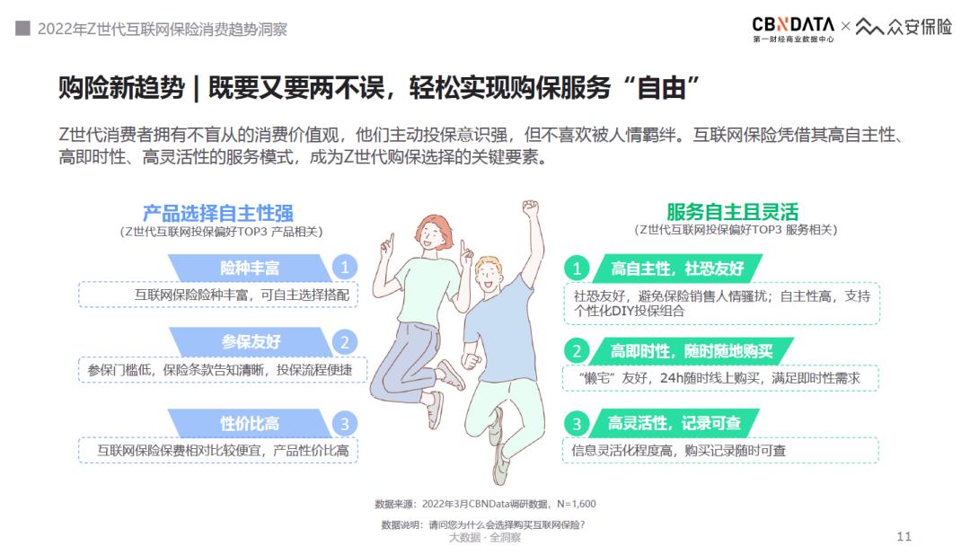 拥有着“个性自我”、“高需求”、“即时满足”等消费标签的Z世代,正在深切影响互联网保险服务的迭代升级。CBNData看到,互联网保险基于Z世代的服务新需求,呈现出产品即服务、体验即服务以及服务数智化三大升级趋势,正以更快速度、更暖温度为年轻人提供“新底气”解法,助推其有力前行。