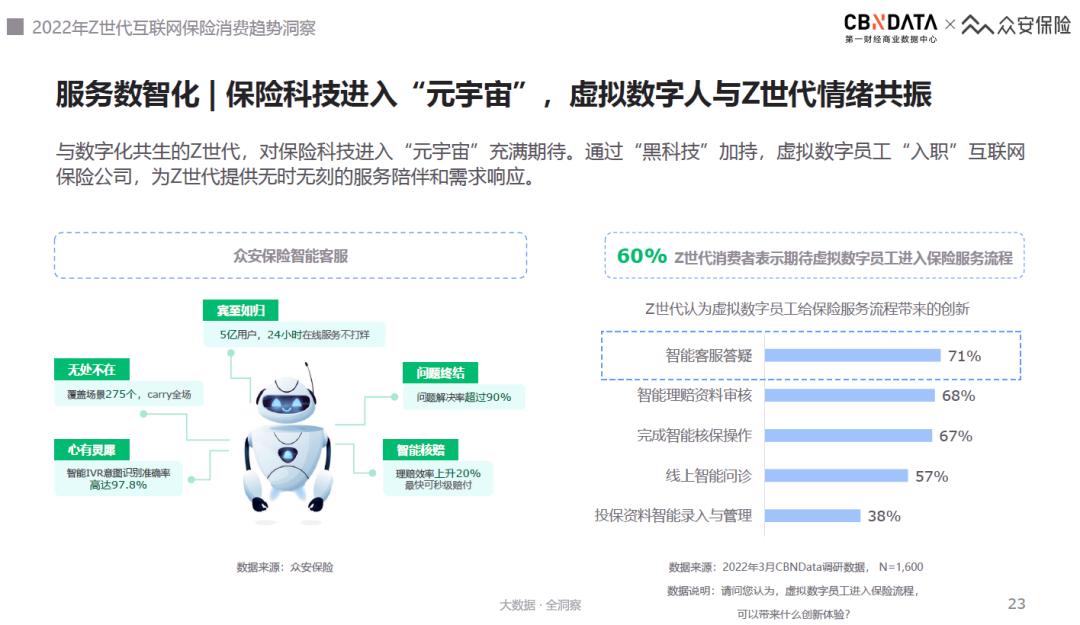 伴随着科技不断进步,保险服务的数智化升级成为2022年互联网保险行业的进阶趋势。值得关注的是,“虚拟数字员工”也逐渐进入保险服务,成为科技赋能的重要成果之一。例如,众安保险通过“黑科技”加持,将“虚拟数字员工”引入日常服务流程中,为Z世代提供无时无刻的服务陪伴和需求响应。