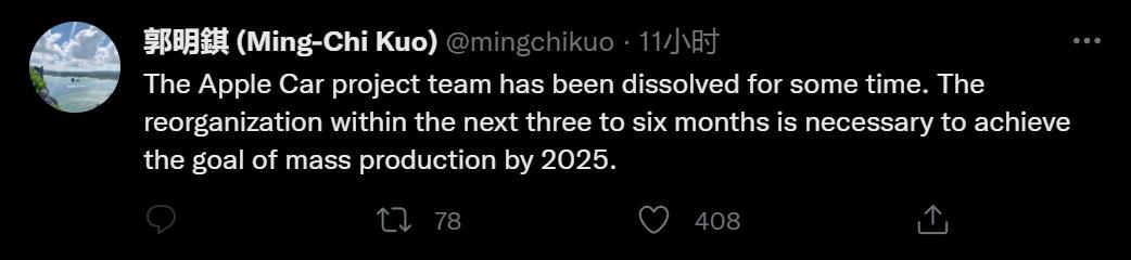 3月15日晚间,知名分析师郭明錤在推特上爆出猛料:苹果汽车团队已经解散了一段时间。如果想在2025年量产Apple Car,必须在3~6个月内进行团队重组。