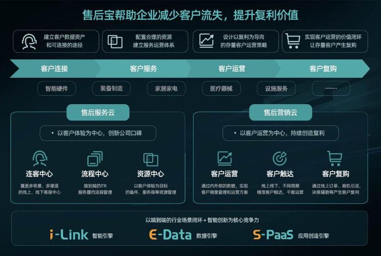 售后宝从客户连接、客户服务、客户运营、客户复购四个维度,提供端到端的客户服务解决方案,让企业在业务运行过程中得到更多反馈和运营数据,实现客户全生命周期管理,。具体到产品层面,根据行业的特点确定业务目标和组织建设,售后宝通过数字化的方式连接客户、服务工程师、运营管理者。针对不同角色,提供不同解决方案:用低门槛触达入口连接客户,解决产品销售出去但缺少客户信息的问题;在工程师APP上,解决服务质量无法保障和工作效率不高的问题;同时通过数据看板和运营工具,解决企业缺乏数据支撑和运营方法的问题。