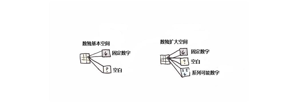 *在一个基本问题空间中,包括了被 1-9 数字赋值的小格的所有可能性集合。在解答的过程中,其实是很难做到 1-9 每个数字在每一行、每一列和每一宫中都只出现一次的。如果想要探索这个空间,就只能一直尝试各种随机组合,直到试出正确答案。