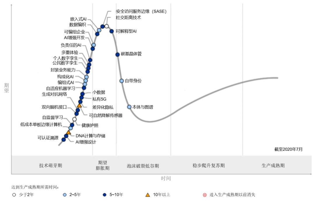 知名信息分析公司高德纳(Gartner)曾提出技术成熟度曲线,将新兴技术成熟过程分为萌芽期、期望膨胀期、泡沫破裂低谷期、稳步爬升复苏期、生产成熟期五大阶段。