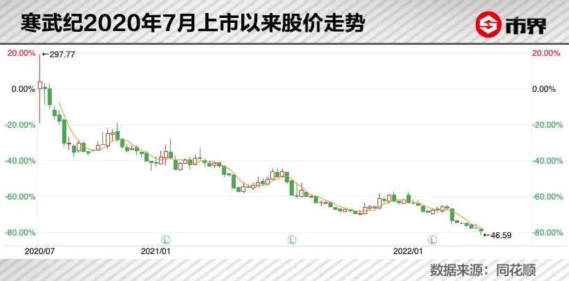 上市就迎来巅峰的寒武纪,之后股价一路向下,截至2022年5月5日收盘,股价为52.9元/股,总市值仅剩212亿元,较最高点跌去了约979亿元,堪称“膝盖斩”。