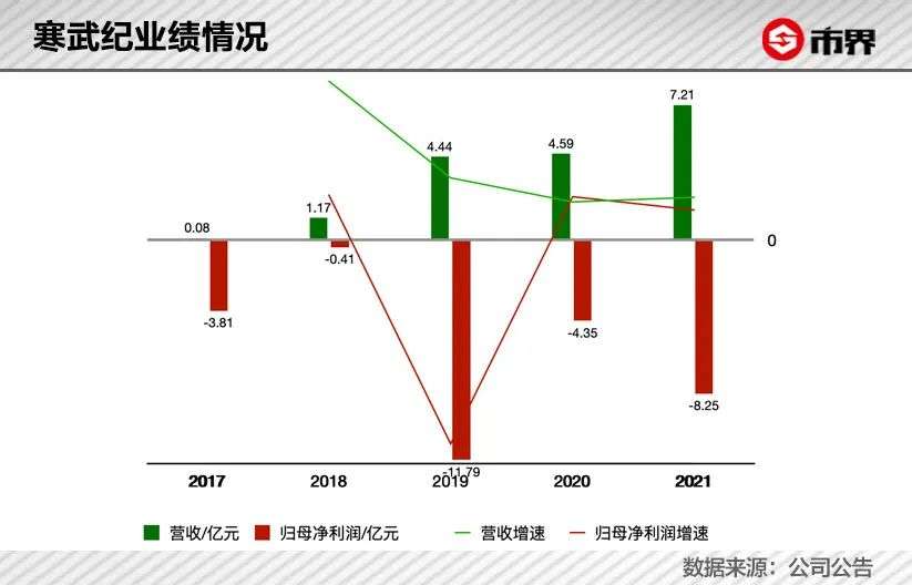 4月16日,寒武纪发布2021年财报:营收7.21亿元,同比增长57.12%;归母净利润为-8.25亿元,上年为-4.35亿元,亏损近乎翻倍。