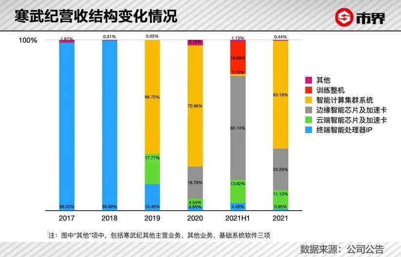 从2019年到2021年,寒武纪营收的最主要来源,变成了智能集群系统。