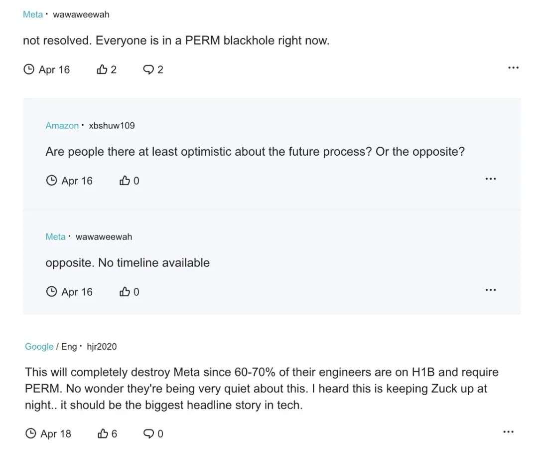 从Meta内部员工传递出来的信息来看,大家都对Perm的申请持悲观态度,表示目前公司层面并没有给出一个很明确的解决时间。在论坛讨论中,一些人认为Meta这个绿卡申请问题的影响被低估了,要知道,目前Meta的工程师团队有几乎一半以上都是以H1B的身份在工作。