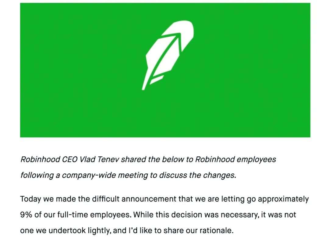 最近,硅谷此前的科技新星、有“散户大本营”之称的Robinhood也实在顶不住业绩下滑和股价暴跌的压力,宣布了一轮比例高达9%的大裁员。