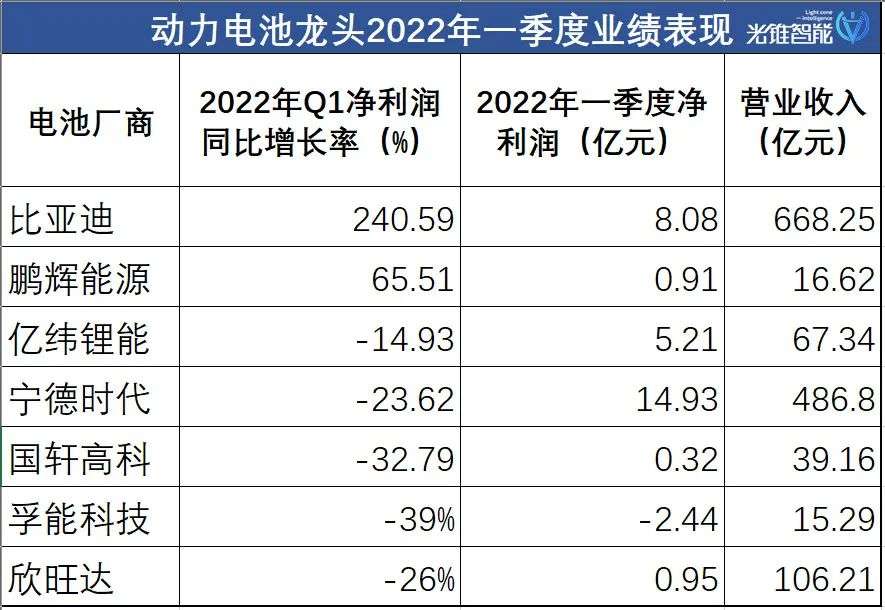 截止2022年4月29日,国内动力电池主要企业中,一季度净利润增速下跌的除了宁德时代之外,还有孚能科技、国轩高科、亿纬锂能、欣旺达等等,分别下跌39%、32.79%、19.43%、26%。