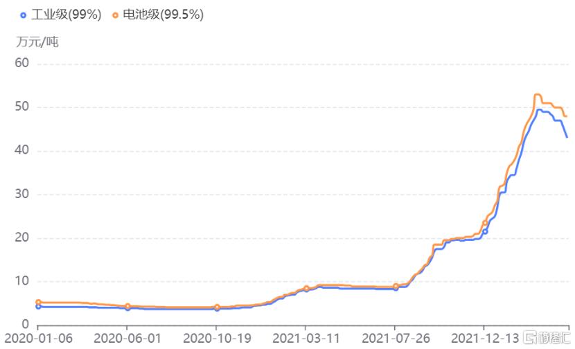 据上海钢联发布数据显示,电池级碳酸锂价格从1月4日的29万元/吨增长至3月1日的50.4万元每吨,增幅近74%。另据百川盈孚数据,目前国内碳酸锂市场主流报价区间在每吨51.4万~52万元之间,同比增长高达500%。