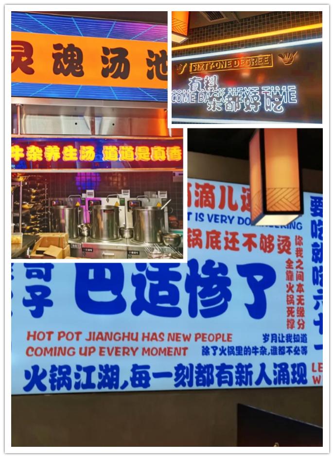 门店内更有一面大大的文案墙,上书“莫愁前路无知己,要吃就吃六十一”、“你我之间本无缘分,全靠火锅死撑”等由诗句、电视剧台词改编的有趣语句,整体氛围轻松、时尚。
