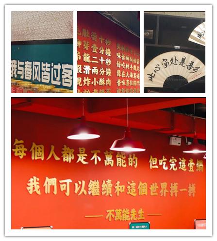 大堂内的墙壁上“每个人都是不万能的,但吃完这一锅,我们可以继续和这个世界搏一搏”一语双关。