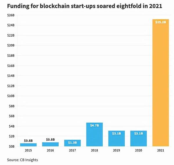 根据CB Insight的数据,区块链初创企业去年筹集了创纪录的 250 亿美元的风险投资,是前一年的八倍多。
