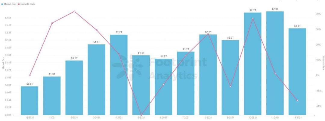 另外,根据Footprint Analytics的数据,全球加密市场总市值在过去一年翻倍增长,目前超过2万亿美元。越来越多的资金,流入去中心化领域。