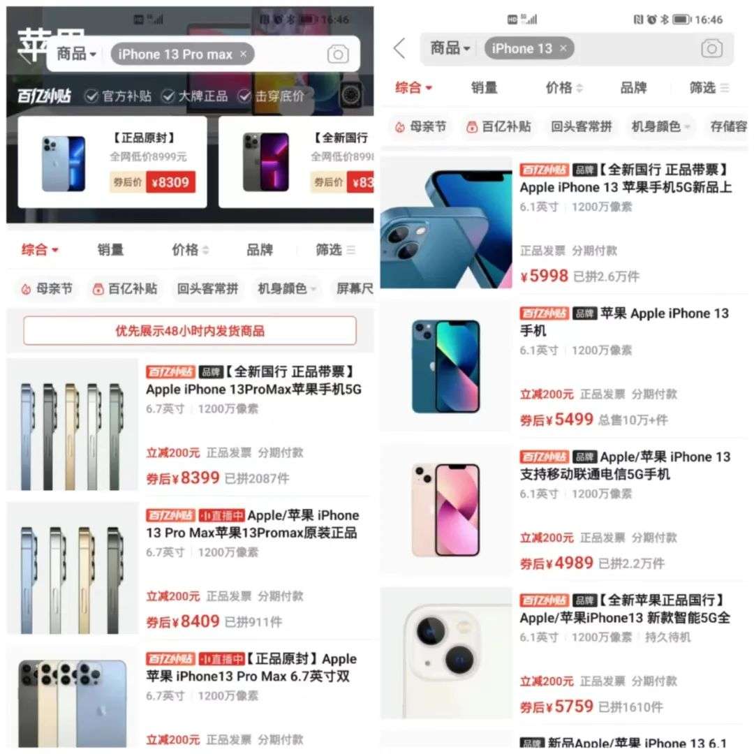 以iPhone 13为例,成色接近全新的售价在短短一个月内,一路从5000多元跌到4000多元,超大杯iPhone 13 Pro Max的二手价格也跌了1000元左右。小雷在电商平台看了一下,百亿补贴活动的iPhone 13只要4899元起,iPhone 13 Pro Max则要八九千,就算不在意保修,海外版二手也还是没有百亿补贴的新机香。