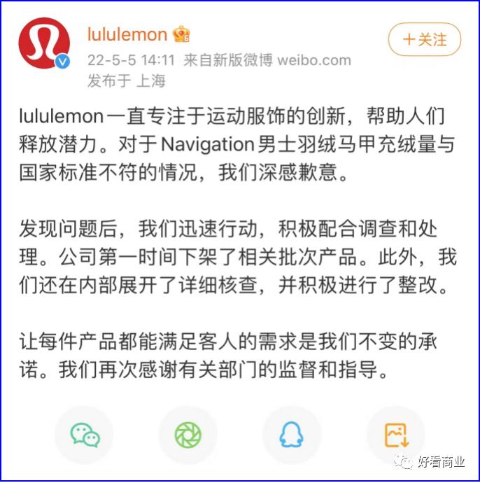 舆论压力之下,Lululemon在官方微博致歉,承认其出售的Navigation男士羽绒马甲充绒量与国家标准不符。他们还称,发现问题后,公司第一时间下架了相关批次产品,并进行了内部核查和整改。